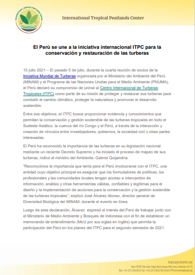14 July 2021 – Peru on July 5 declared its commitment to join the International Tropical Peatlands Center (ITPC) as it seeks to protect and restore its peatlands in an effort to combat climate change, protect nature and promote sustainable development during the fourth meeting of the Global Peatlands Initiative Partners organized by the Ministry of Environment of Peru (MINAM) and UN Environment Programme (UNEP).